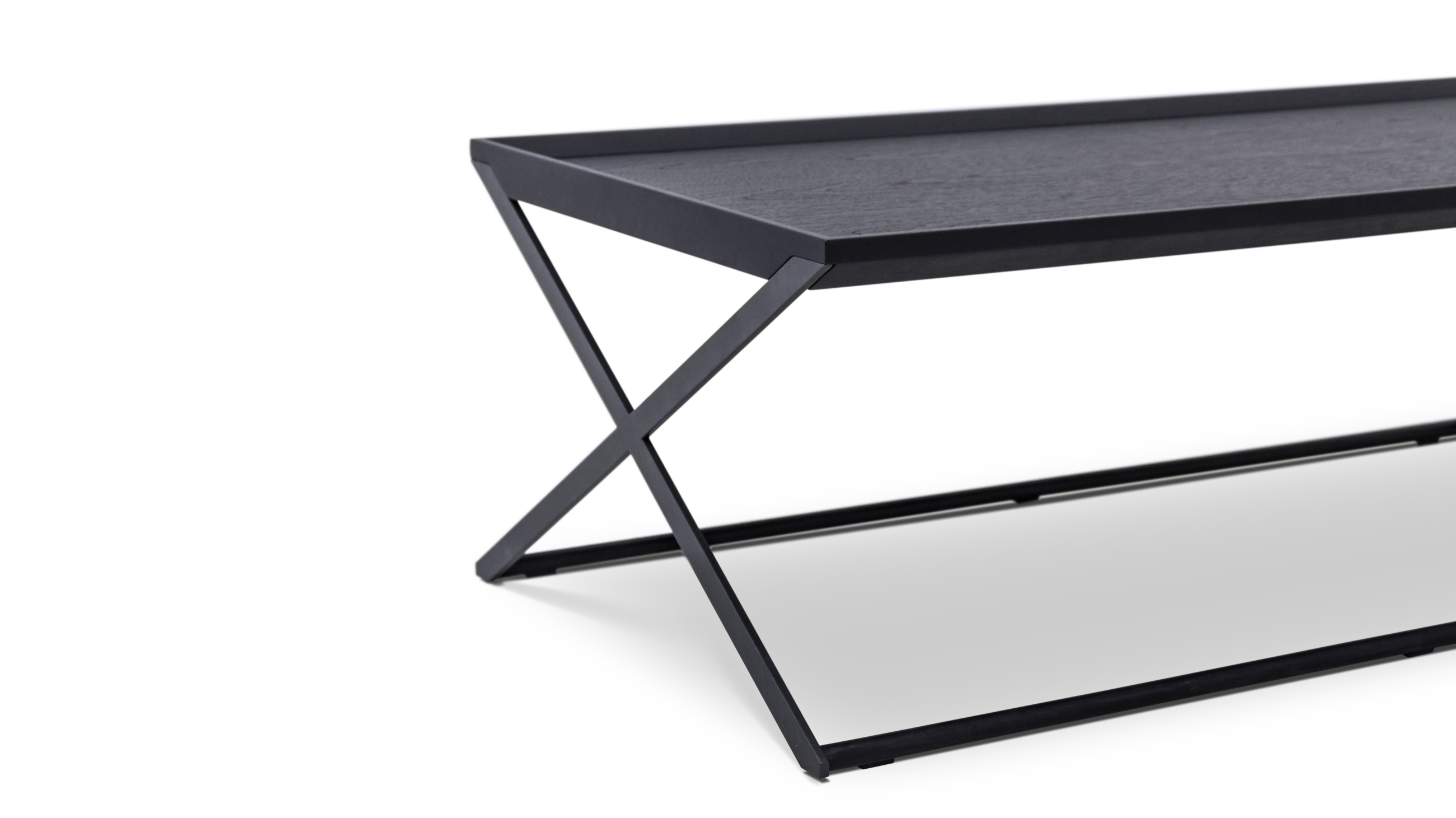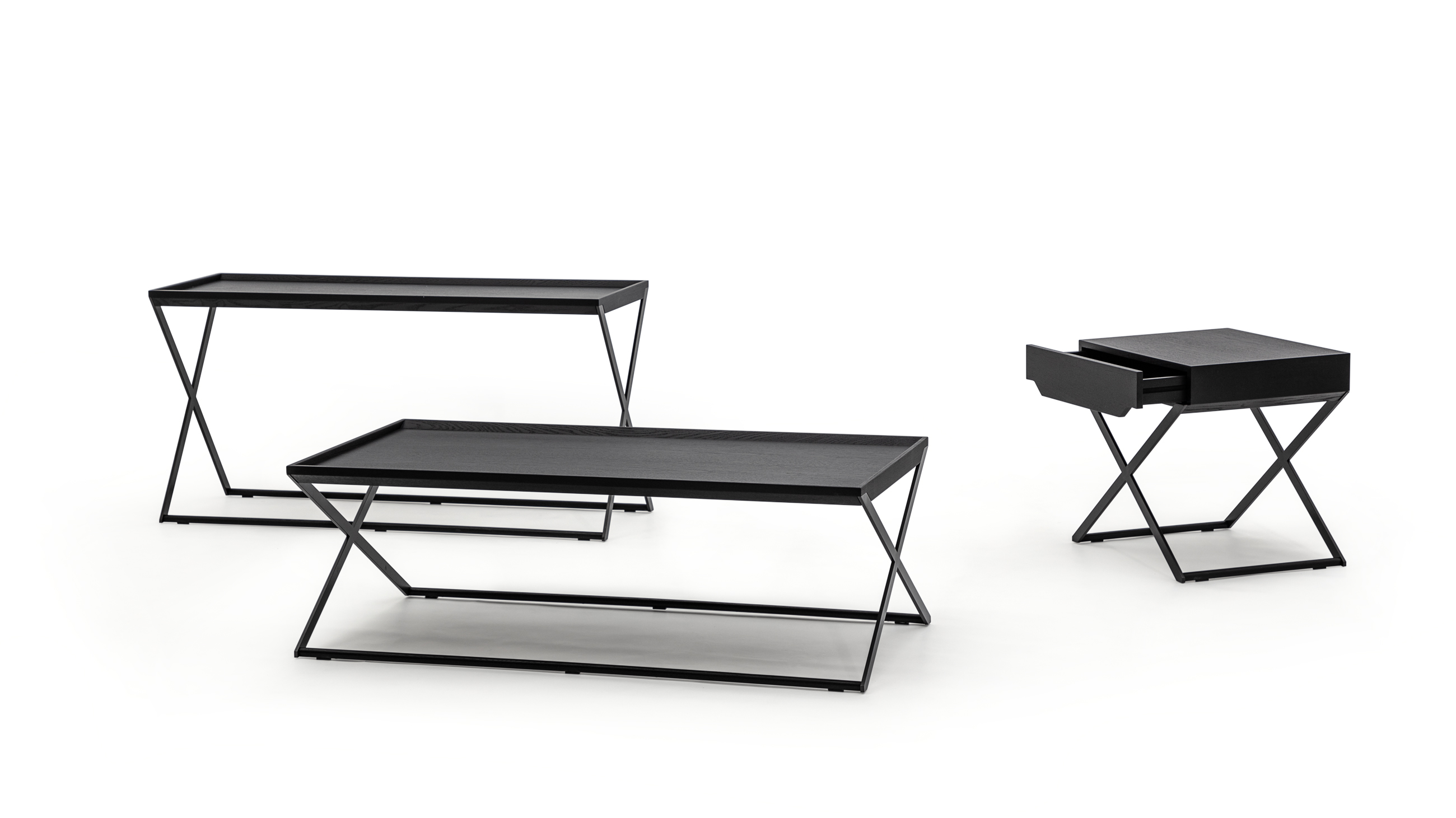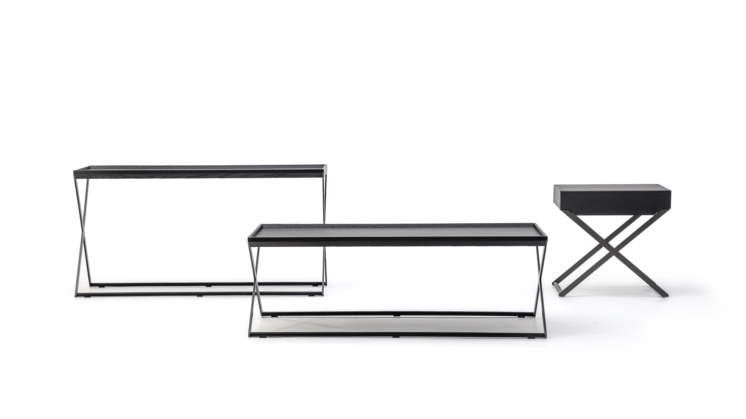 Plate-shaped surface matches perfectly with crossed flat steel legs, eliminating any visual clumsiness. Compact and versatile, it can serve as coffee table, side table, bedside table, or sofa table.