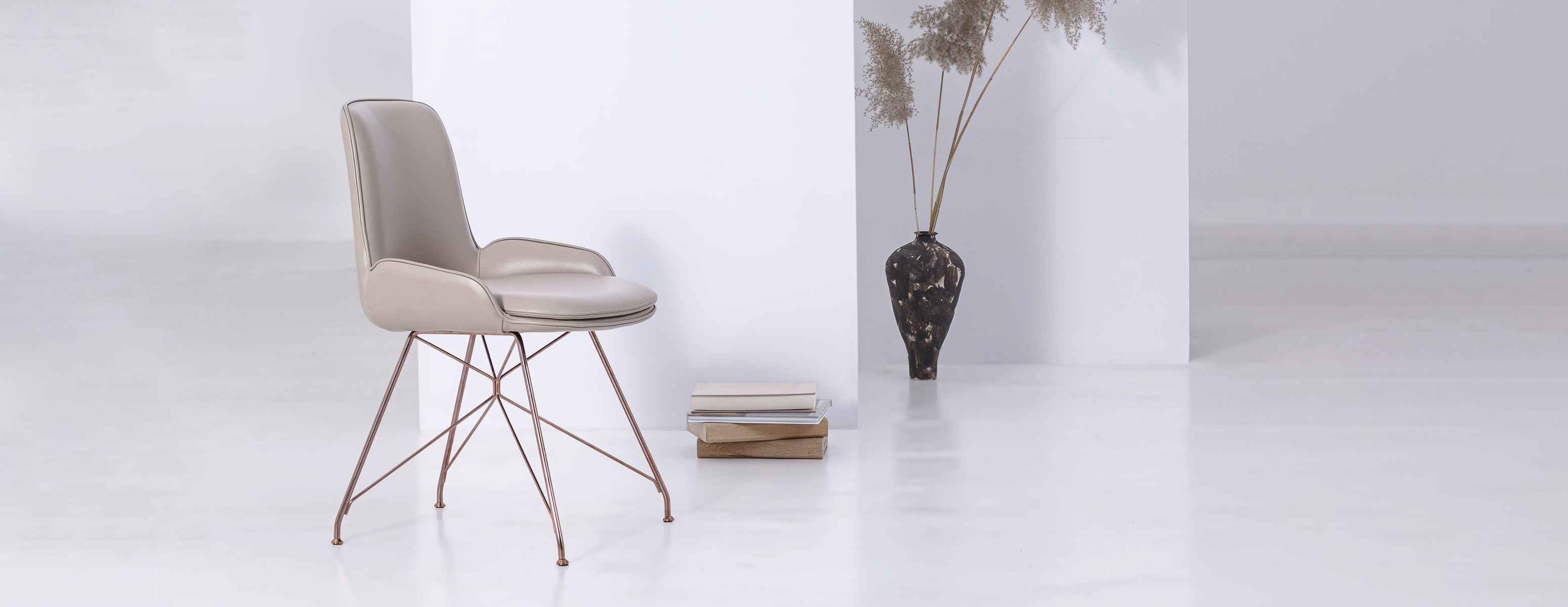 整体形态干练而优雅,兼具美感与辨识度。3D曲面造型椅背,与扶手连贯形成起伏曲线,环抱式承托背部。牙线强调轮廓曲线,勾勒产品质感;类椭圆形实木底腿和金属交叉腿,增加优雅气质。