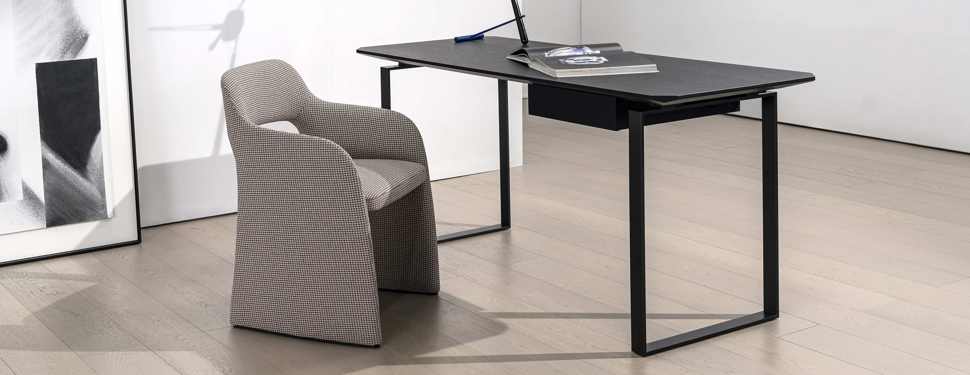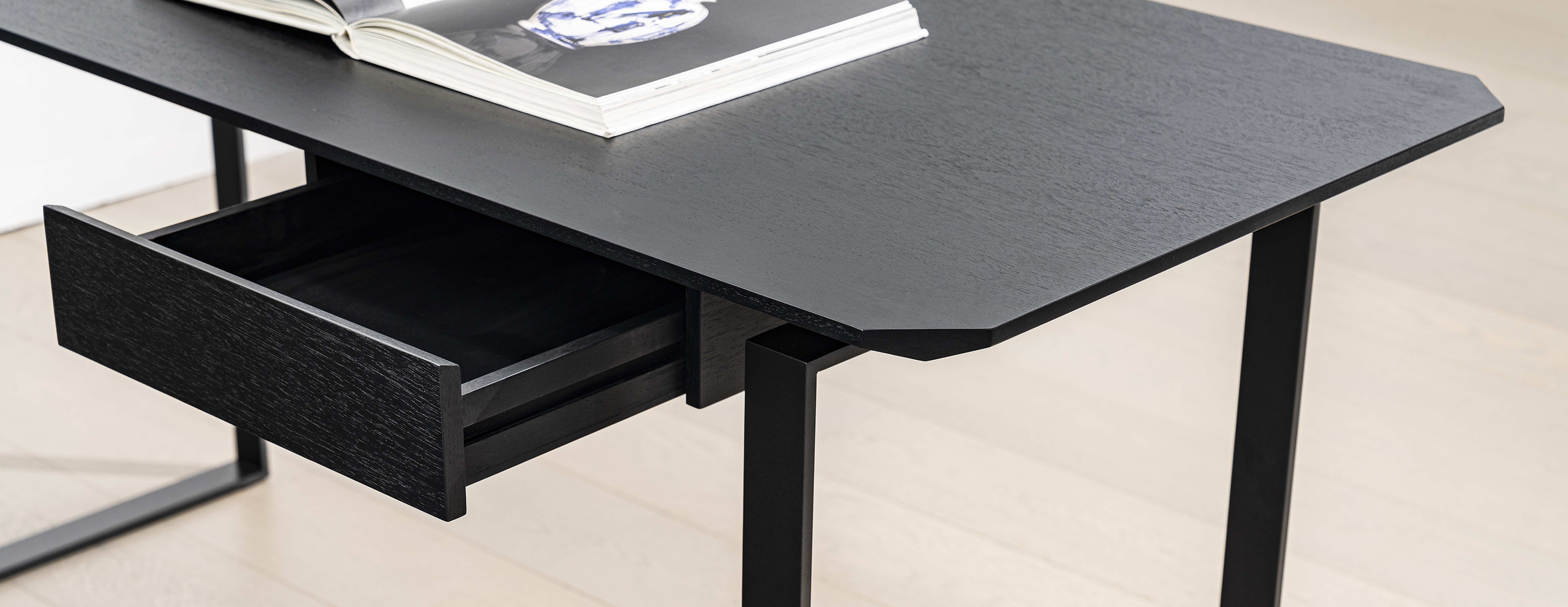 桌面、桌腿、抽屉等不同方向和角度的切面,为产品赋予了未来感,可用作餐桌或书桌。