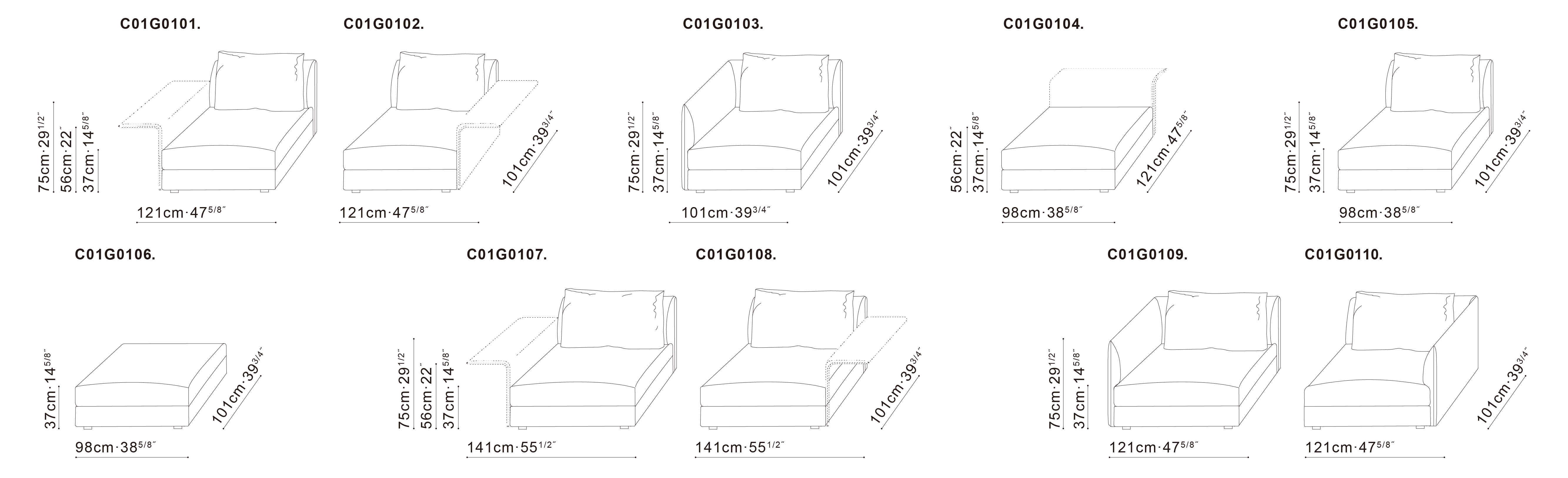 L型扶手,位置随心而动,增加空间和功能的多元性;六边形转角位,带来非凡的组合能力;靠包采用一字型拉线装饰,丰富视觉美感。
