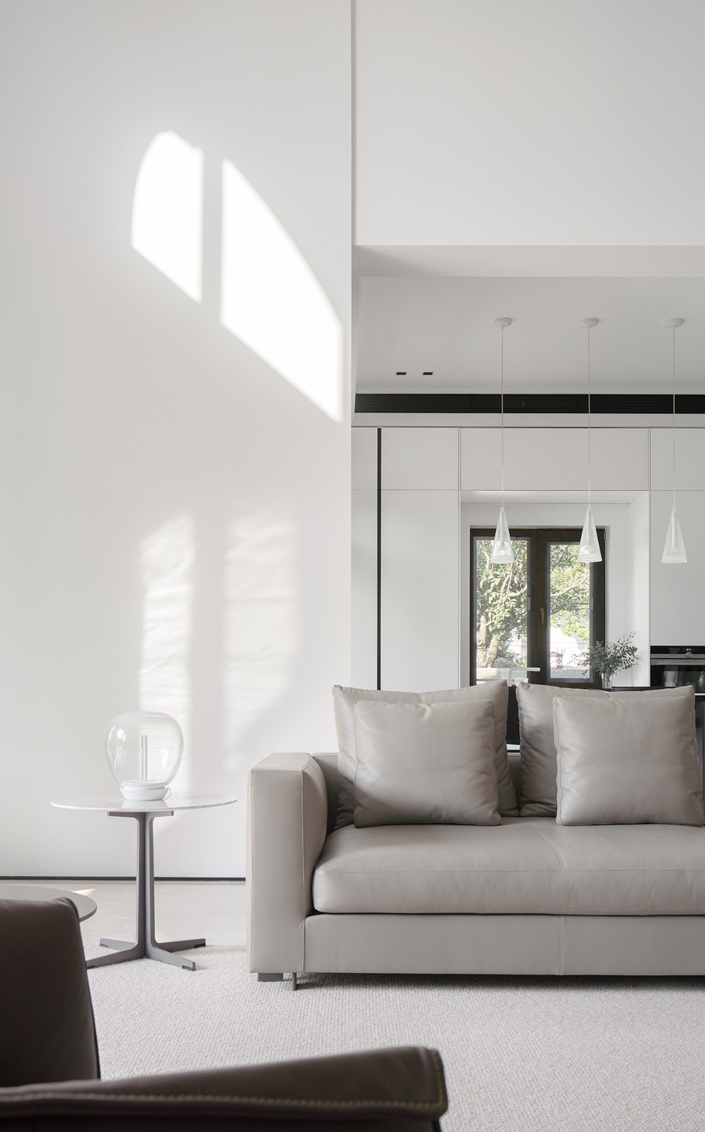 The whole building retains a linear design. The space of each floor is linearly organized and distributed. The transparent glass and the open layout of the living room blur the boundary between indoor and outdoor spaces. Each area enables the interaction between people and the space in simple lines and harmonious proportions. While maintaining a clean, sleek and rhythmic visual effect, it also shows a clear understanding of the fact that the function of the space is to provide a background for daily life. There are enough room among the living room, kitchen, dining room, guest room, washing room and other functional areas, as well as between the floors, for people to come and go freely.