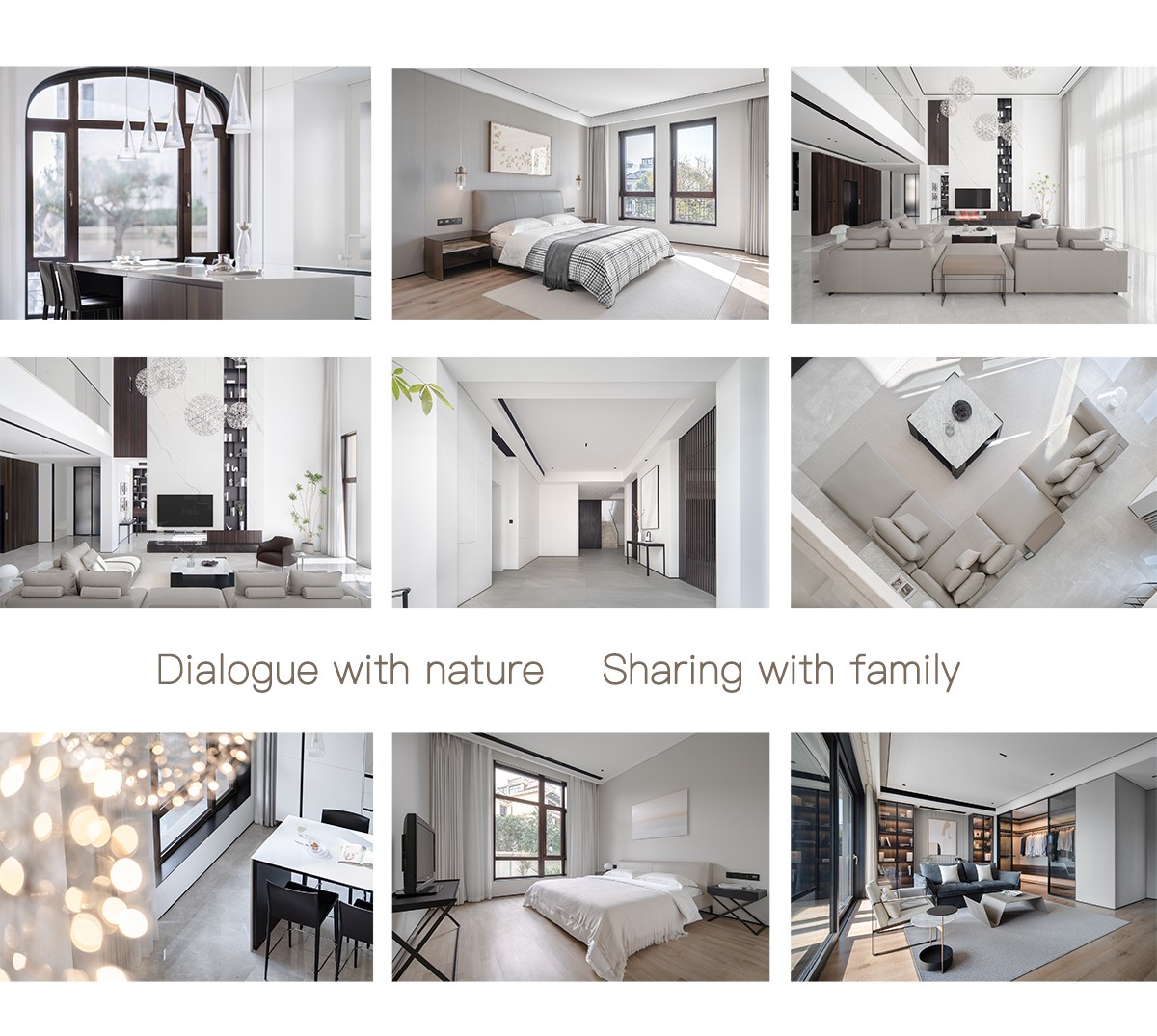The whole building retains a linear design. The space of each floor is linearly organized and distributed. The transparent glass and the open layout of the living room blur the boundary between indoor and outdoor spaces. Each area enables the interaction between people and the space in simple lines and harmonious proportions. While maintaining a clean, sleek and rhythmic visual effect, it also shows a clear understanding of the fact that the function of the space is to provide a background for daily life. There are enough room among the living room, kitchen, dining room, guest room, washing room and other functional areas, as well as between the floors, for people to come and go freely.