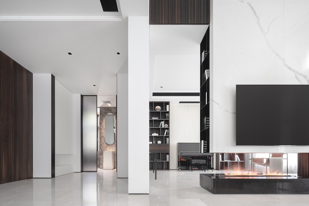 The whole building retains a linear design. The space of each floor is linearly organized and distributed. The transparent glass and the open layout of the living room blur the boundary between indoor and outdoor spaces. Each area enables the interaction between people and the space in simple lines and harmonious proportions. While maintaining a clean, sleek and rhythmic visual effect, it also shows a clear understanding of the fact that the function of the space is to provide a background for daily life. There are enough room among the living room, kitchen, dining room, guest room, washing room and other functional areas, as well as between the floors, for people to come and go freely.