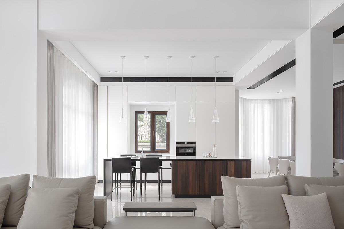 The whole building retains a linear design. The space of each floor is linearly organized and distributed. The transparent glass and the open layout of the living room blur the boundary between indoor and outdoor spaces. Each area enables the interaction between people and the space in simple lines and harmonious proportions. While maintaining a clean, sleek and rhythmic visual effect, it also shows a clear understanding of the fact that the function of the space is to provide a background for daily life. There are enough room among the living room, kitchen, dining room, guest room, washing room and other functional areas, as well as between the floors, for people to come and go freely.