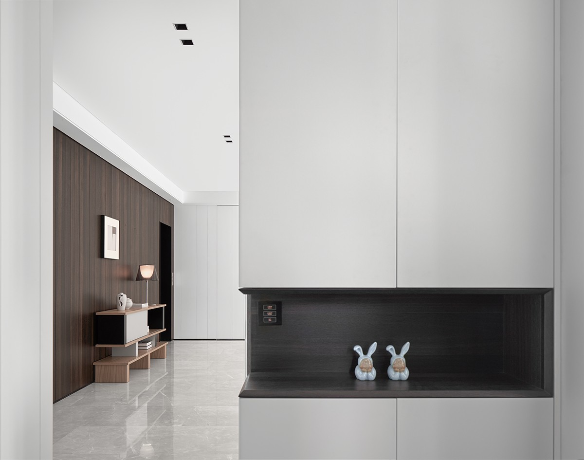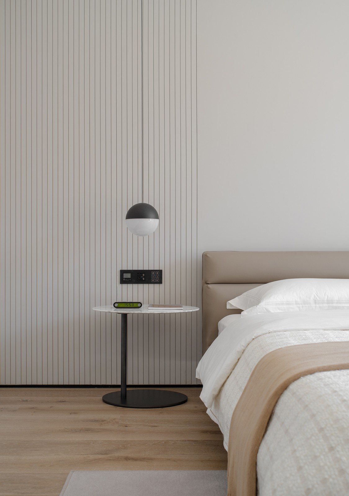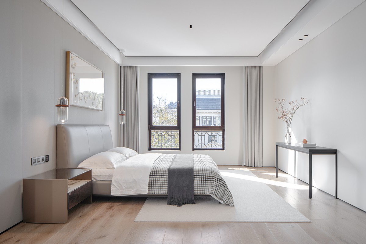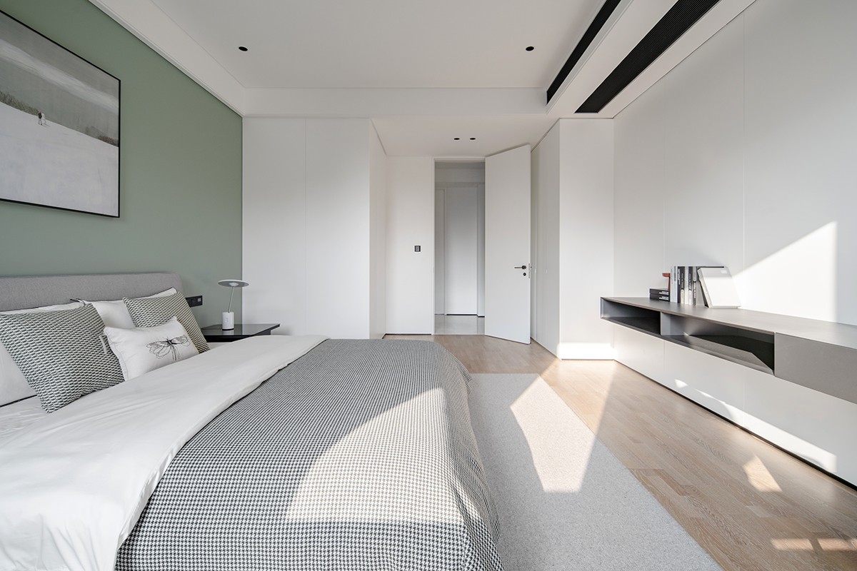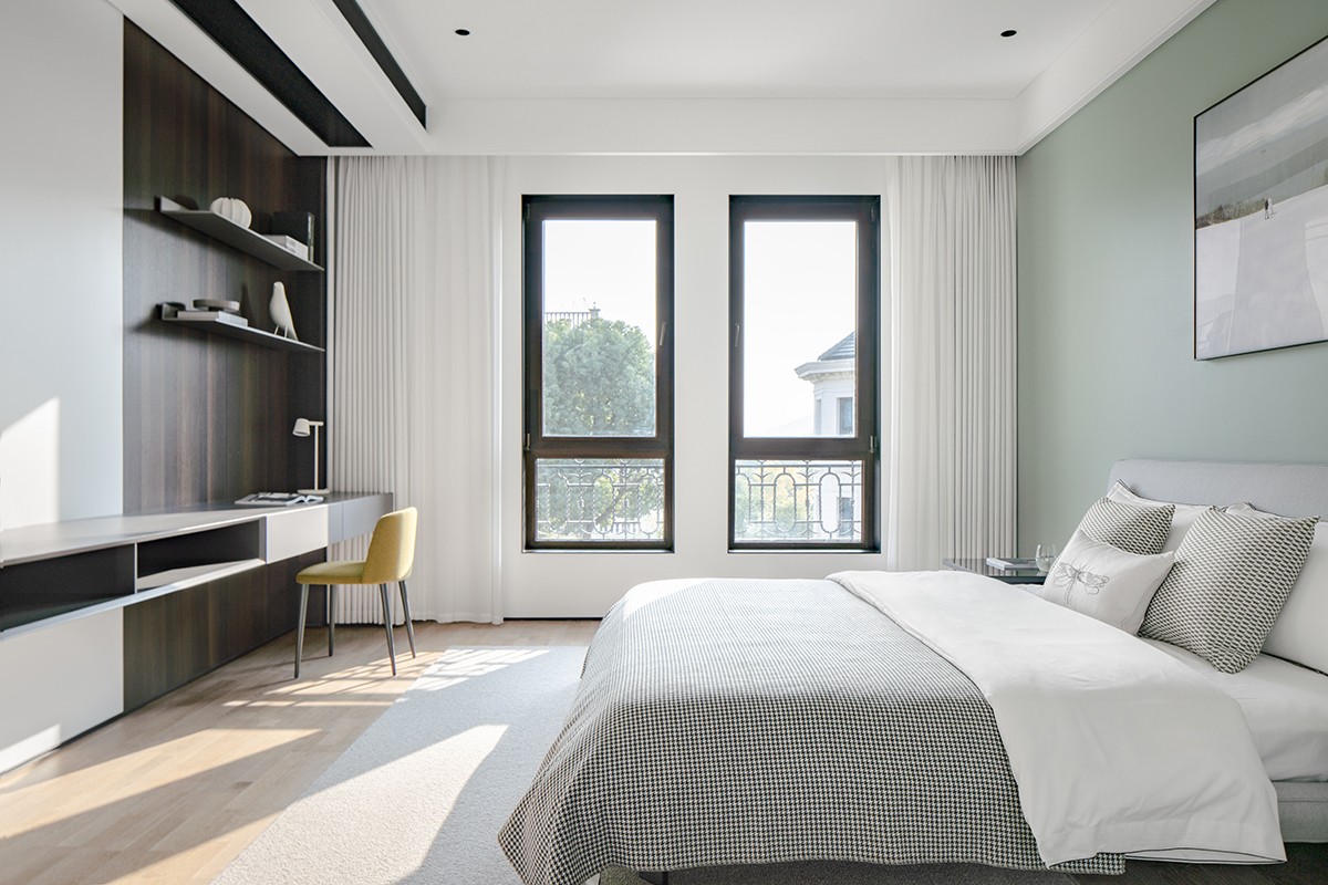 Calmness comes from pure colors. In the living space, the color scheme should be soothing, especially in the bedroom. The white plus wood color scheme in a private space seems simple but smart. It satisfies one's longing for nature while creating a cozy atmosphere. The large area of white in the bedroom allows natural light to be fully reflected on the wall, the ceiling and every surface. The bright light and open space meet the family's needs to both study and work in their own spaces.