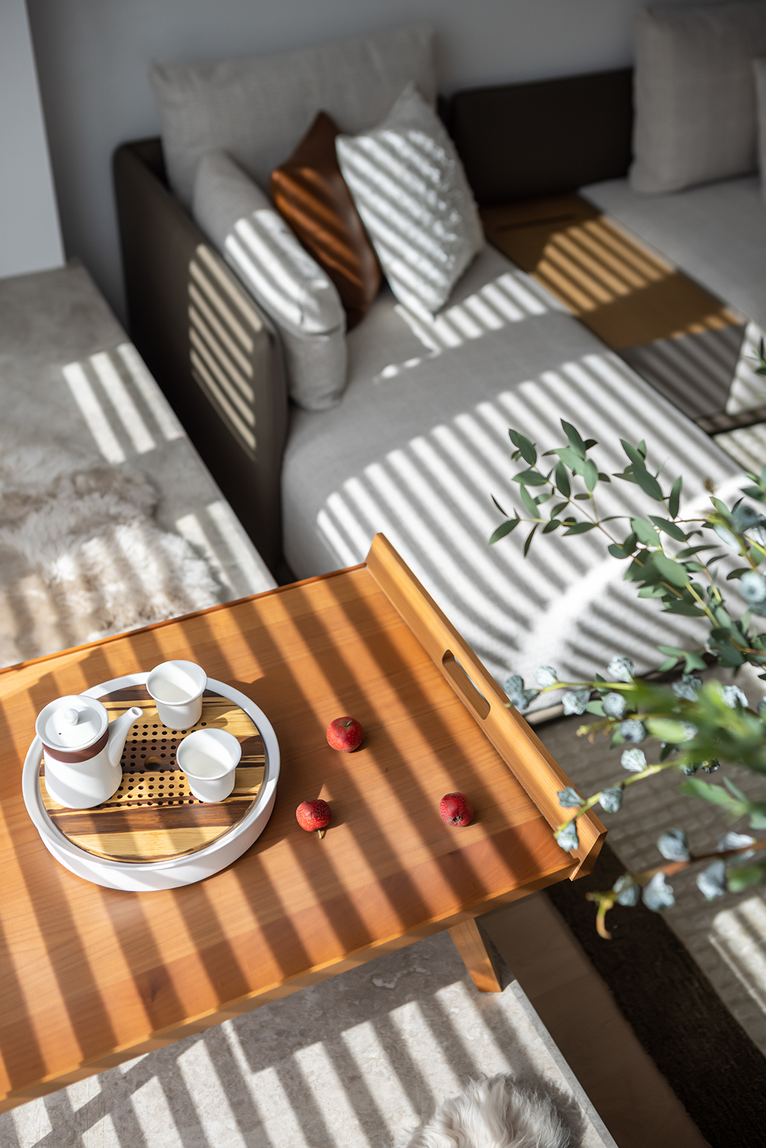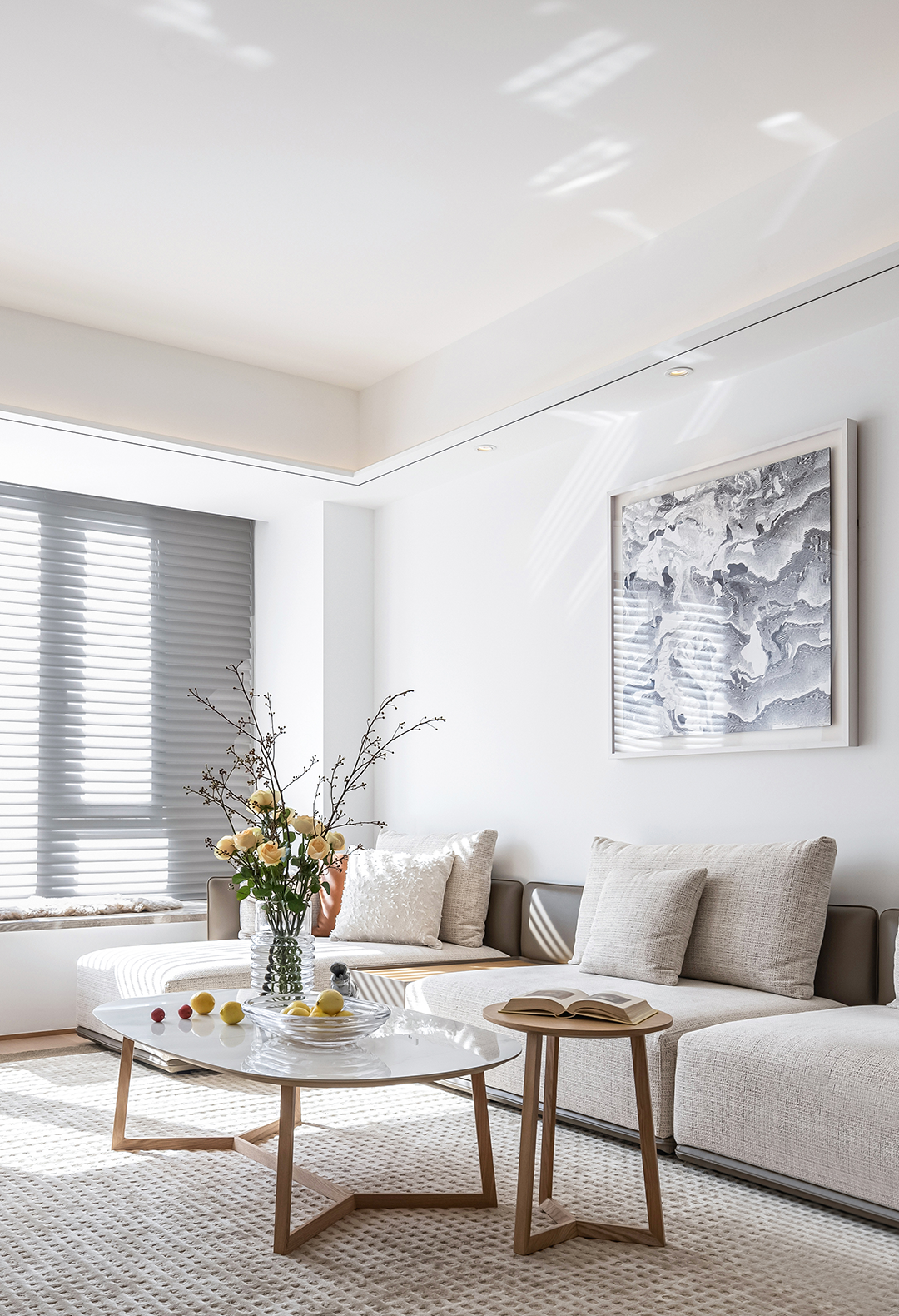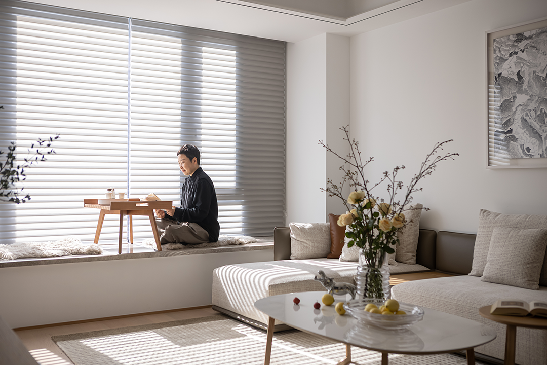 A healing home that resonates to the wood aesthetic evokes the love of life in every detail. The wooden and off-white furniture in the sunlit living room looks particularly soft and clean. The cozy atmosphere in the room warms you up on cold winter days.