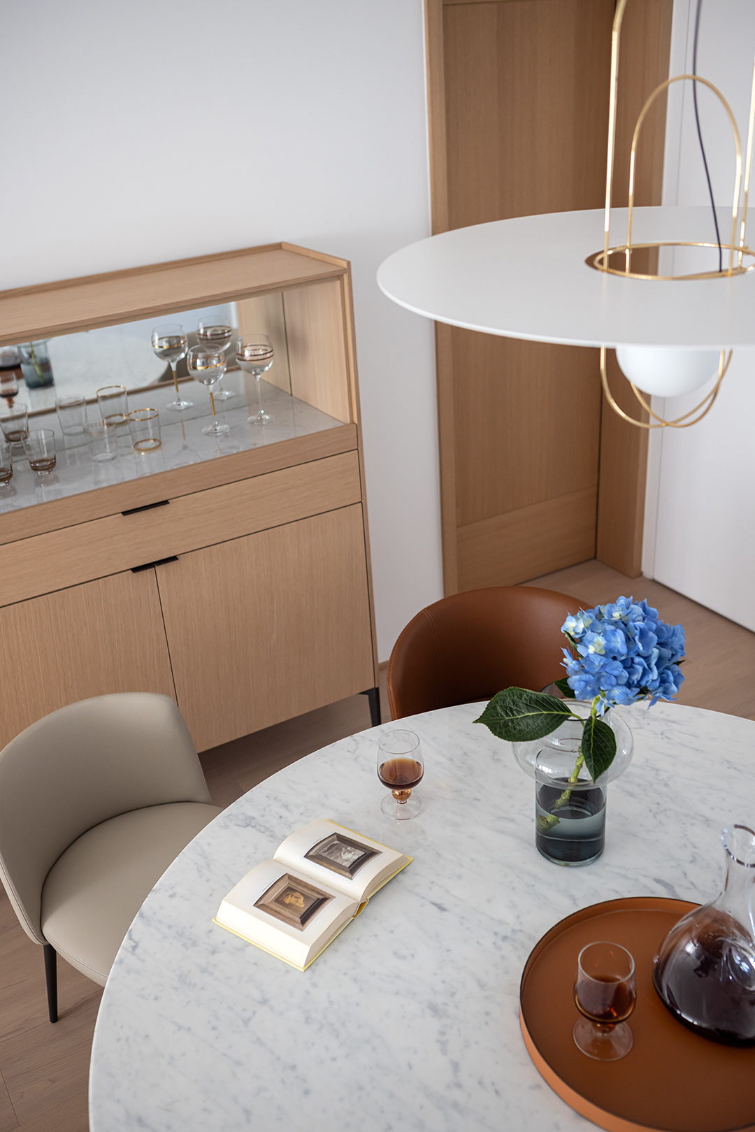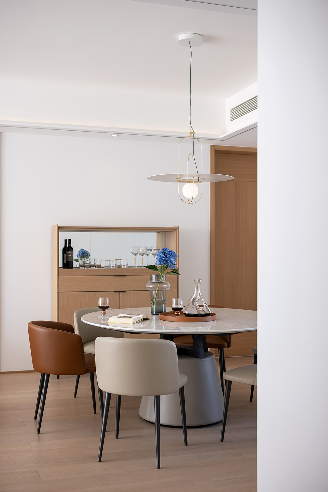 In the dining room, there are the meticulously crafted UNITY table designed for family dinners and the BALLET chairs with smooth and beautiful lines. The flowers on the marble table top add a natural touch to the dining area.