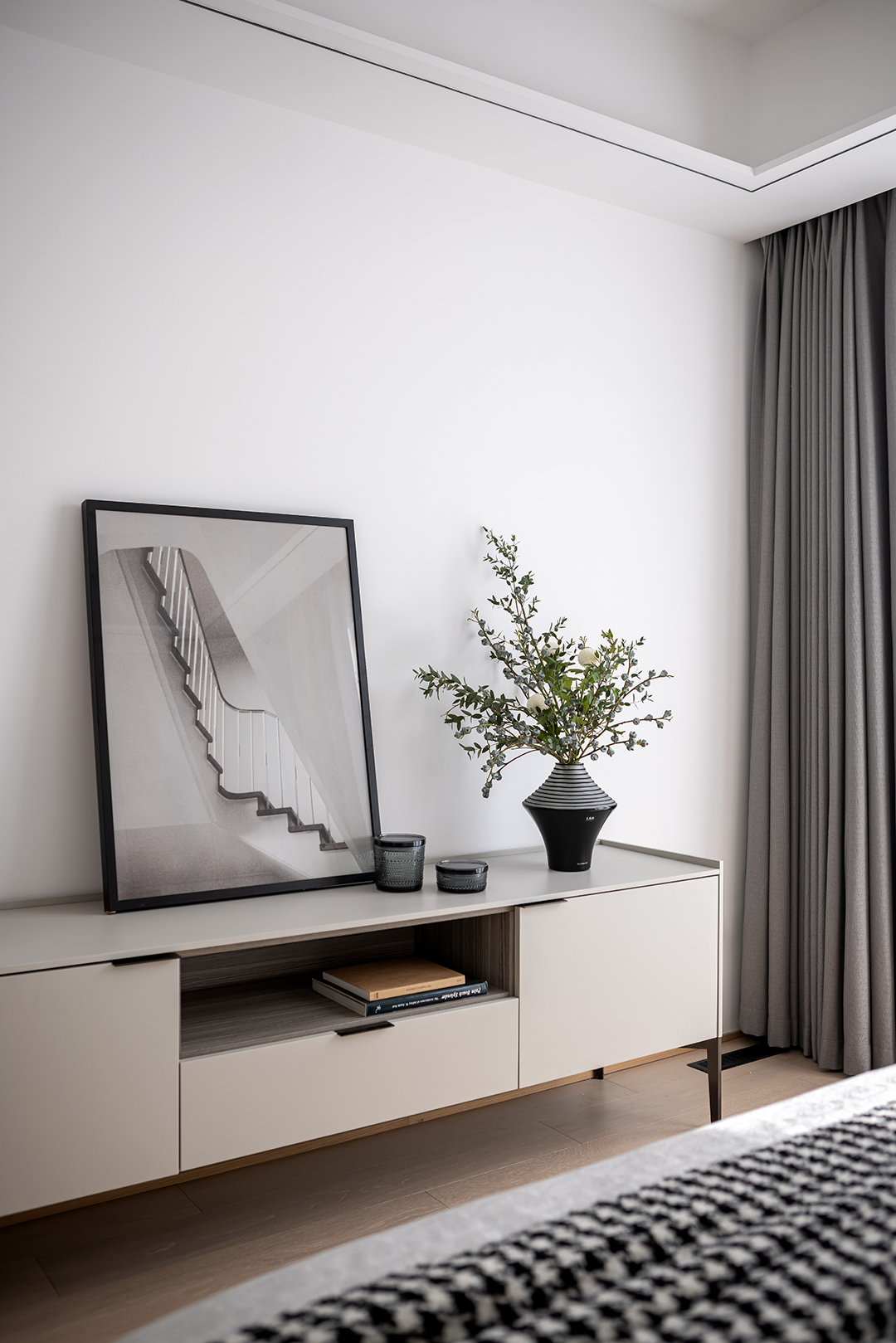 The soft tones and the natural wooden elements are well combined to create an elegant and tranquil atmosphere in the master bedroom, while the black and white bedding adds a contrast and creates a rich and layered visual effect.
