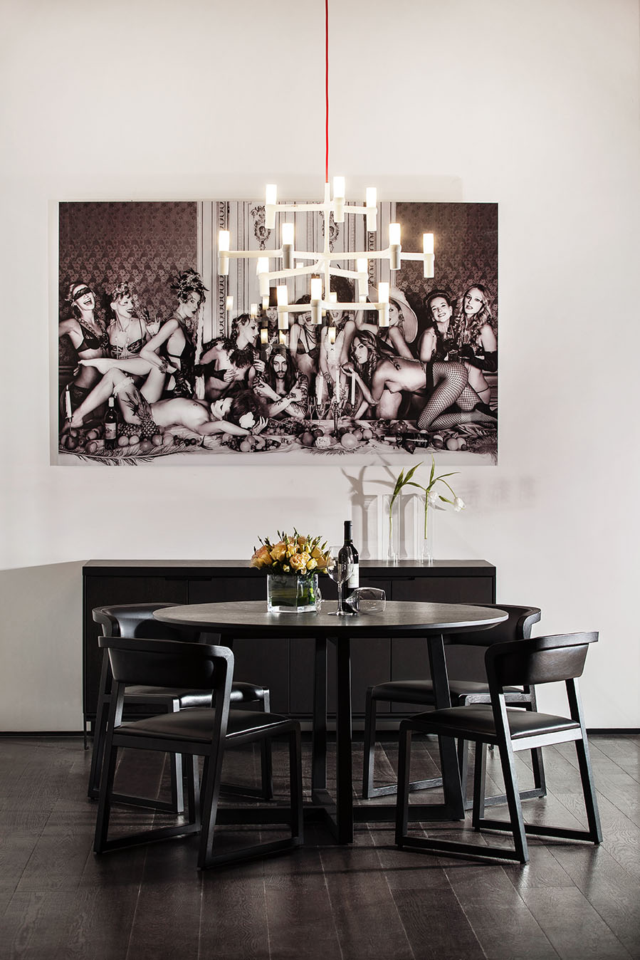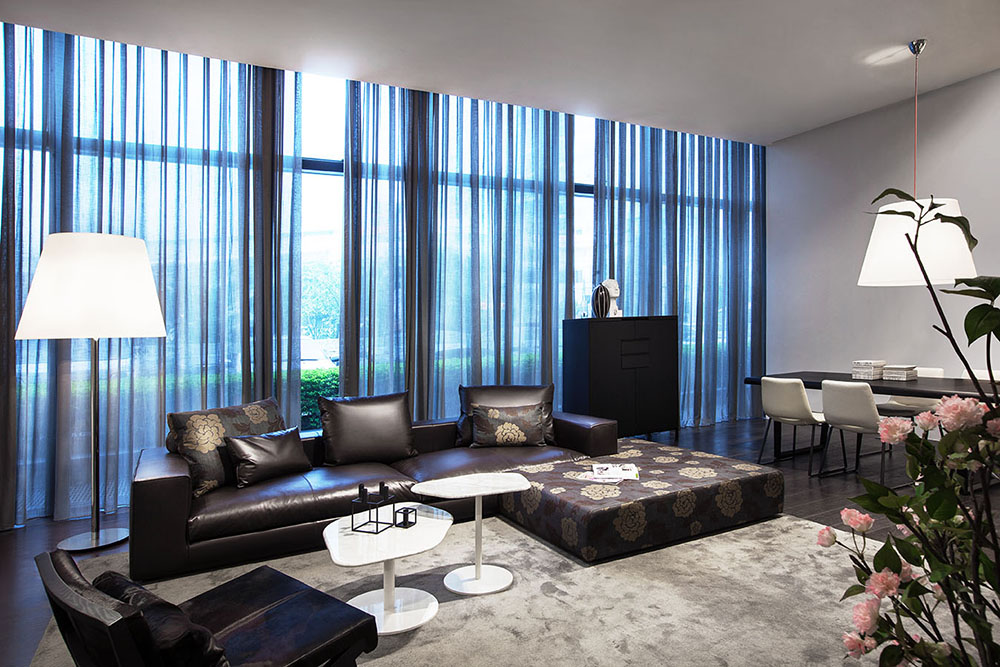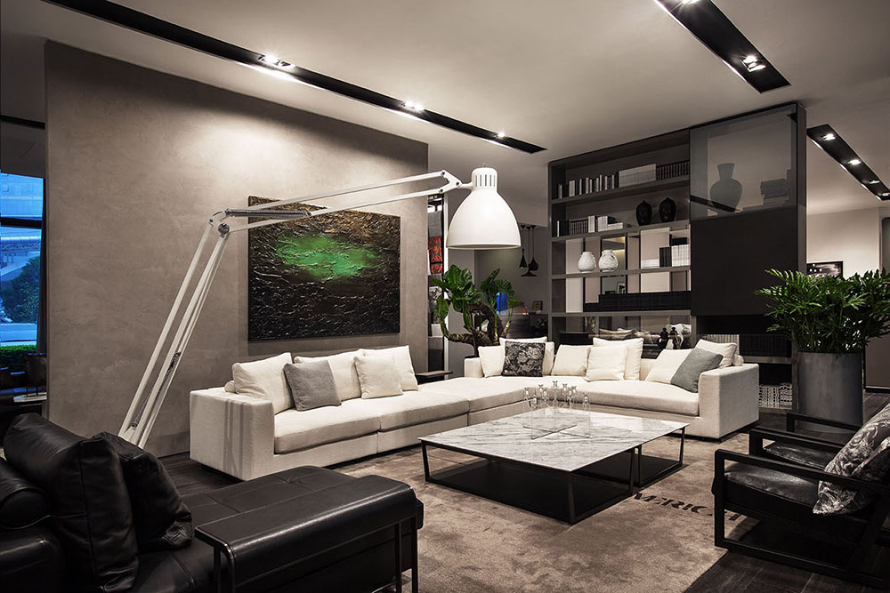 The CASA sofa and the HANNA coffee table work together to present a neat, elegant sitting room. The VESSEL desk interacts with the AVALON sofa to build a quiet, yet vigorous study. The VESSEL dining table and the MING chairs are designed to ensure the sweetest dining moments for your family. Coated with traditional paint handmade in Venice, Italy, the interior walls shine with a natural beauty, as well as a touch of history amid the tender light. The works of world-famous modern artists, including Jordi Gomez and uniquely shaped lamps from Nemo Cassina and FontanaArte, and the all-star CAMERICH product portfolio work seamlessly to shape a modern, stylistic store.