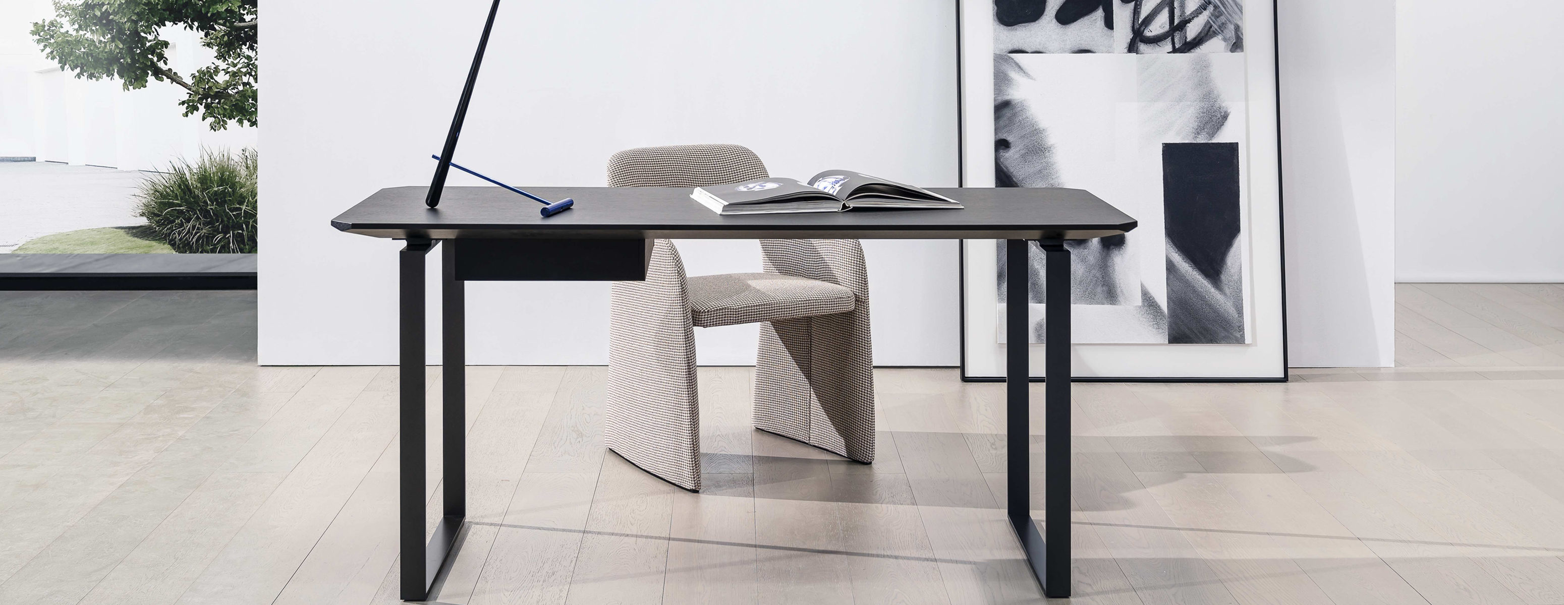 Its tapered edges and angled legs help shape a geometric look but still read smart and practical. This VERGE table series can be used as dining table or study desk.