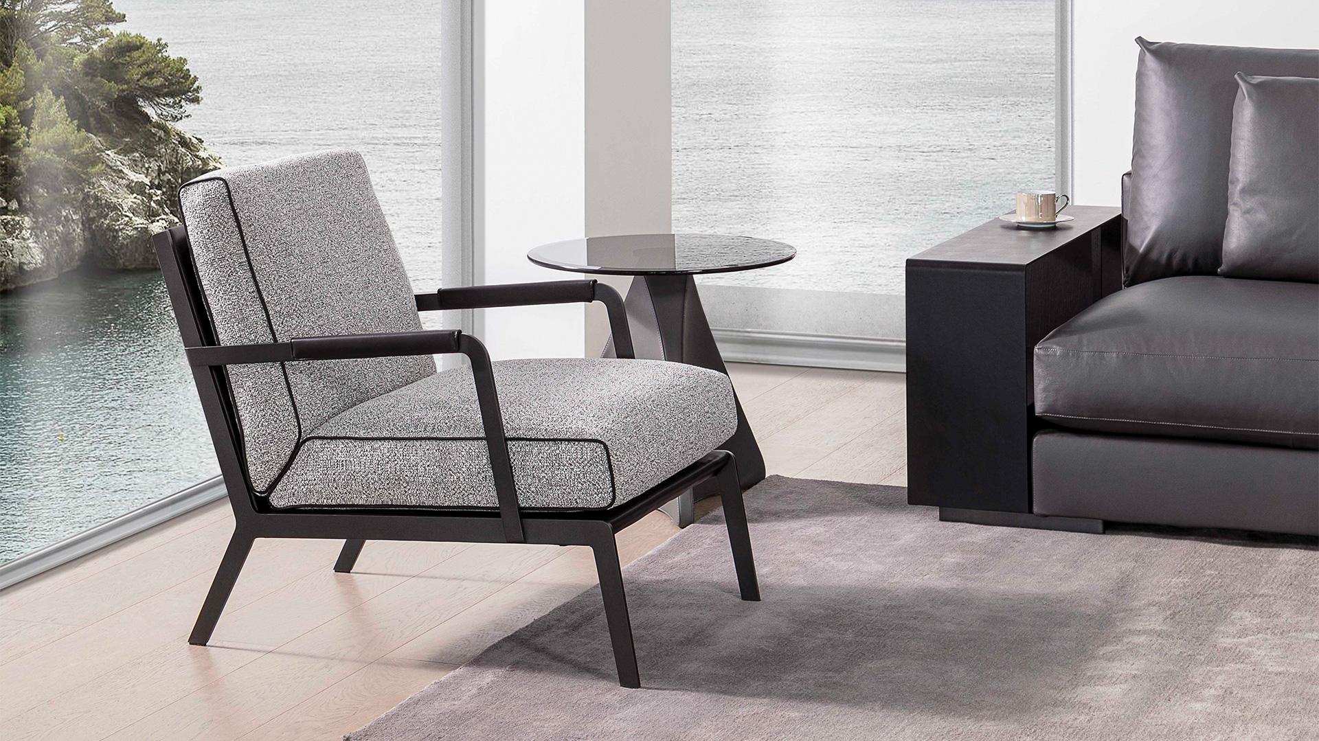 轮廓清晰,皮质滚边勾勒出流畅的侧面线条,于目所能及的舒适感中加入极简的笔触;冷质金属扶手与暖质软包搭配的相得益彰,硬朗的外壳下藏着柔软的内”芯”和恰到好处的关怀。
